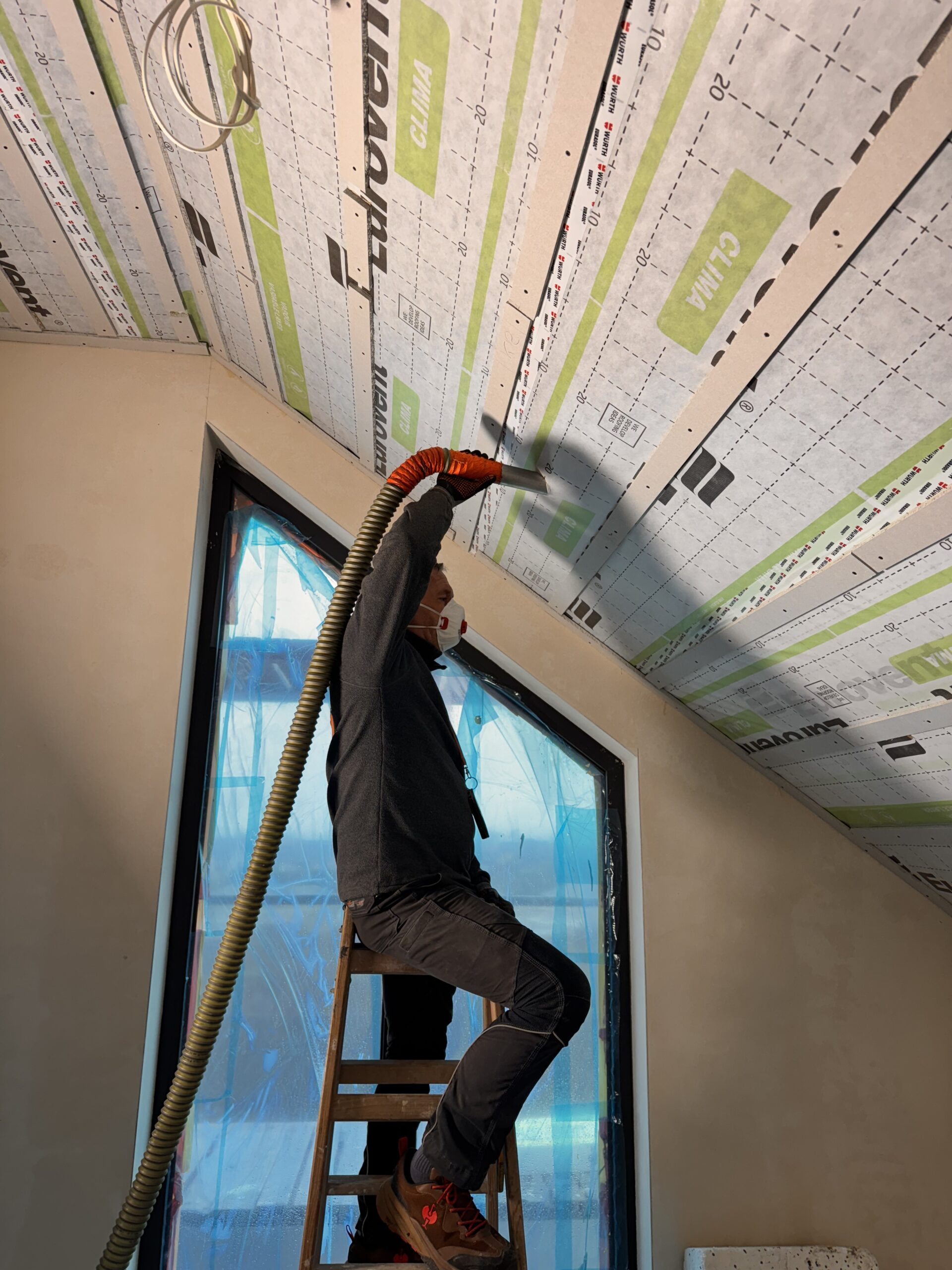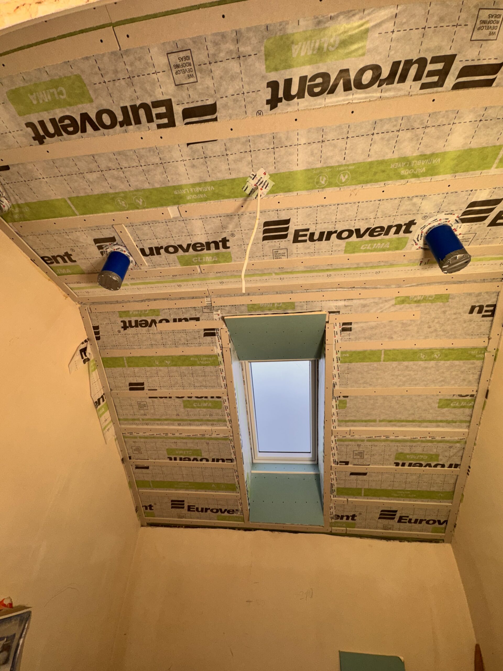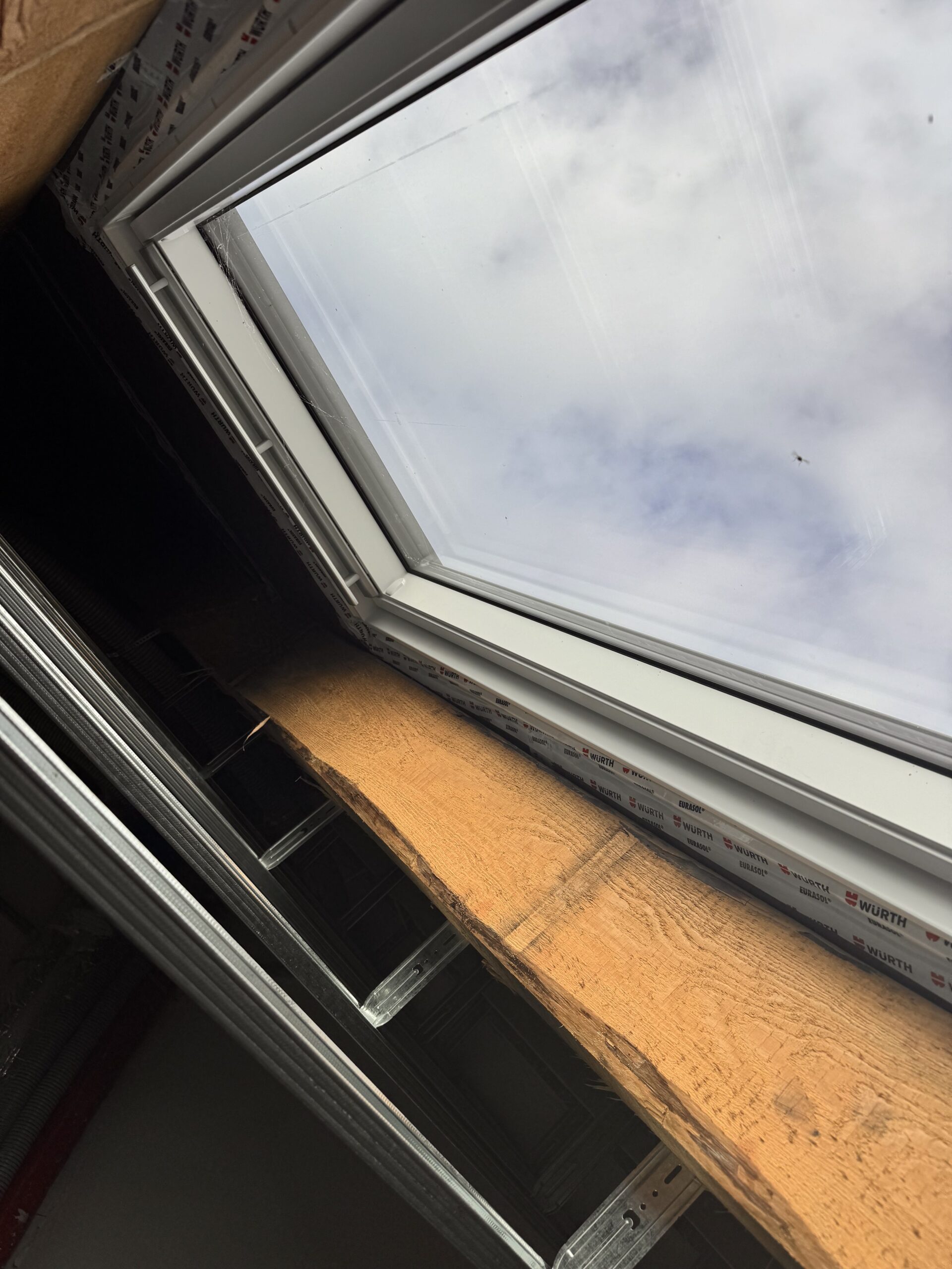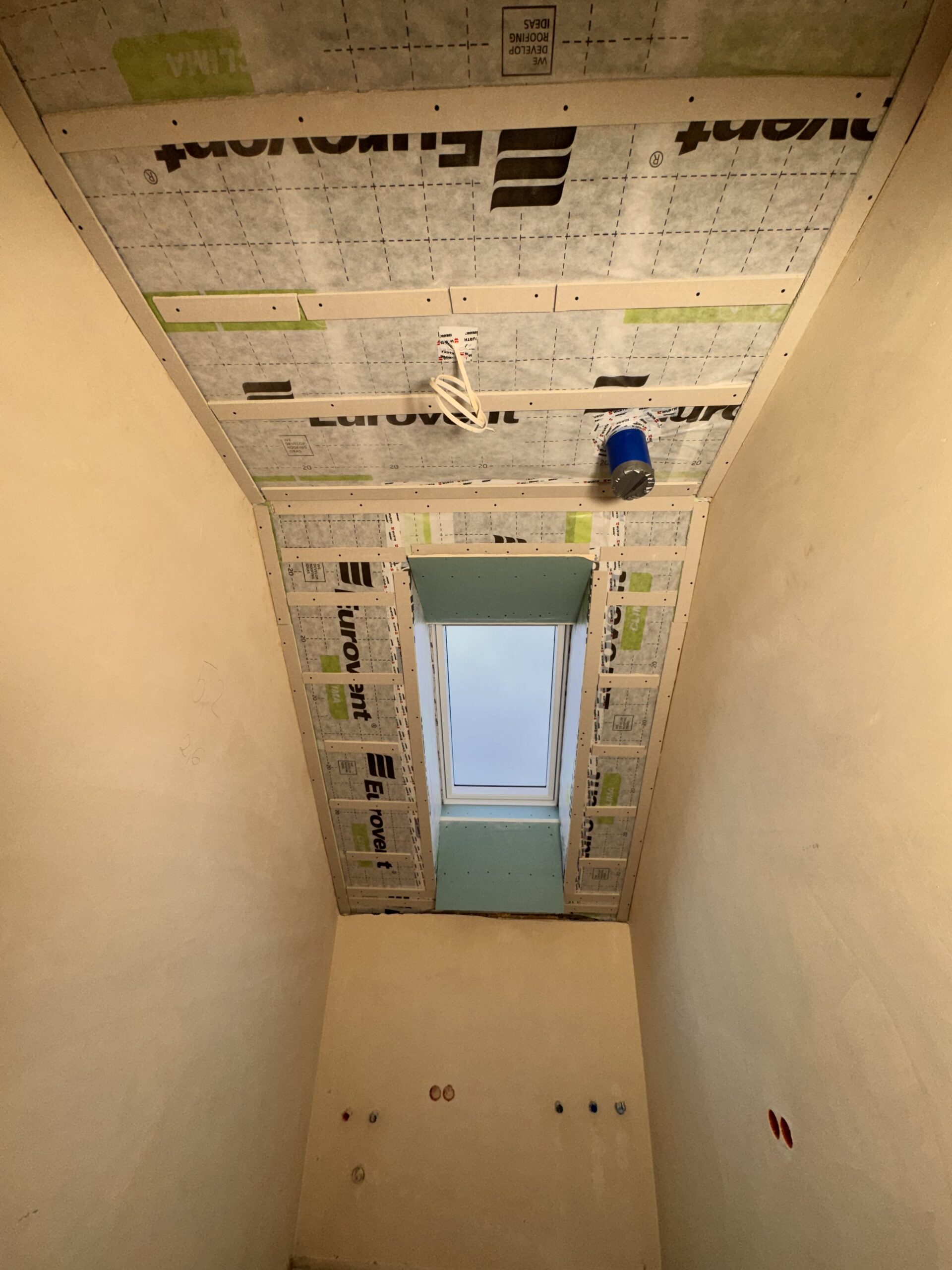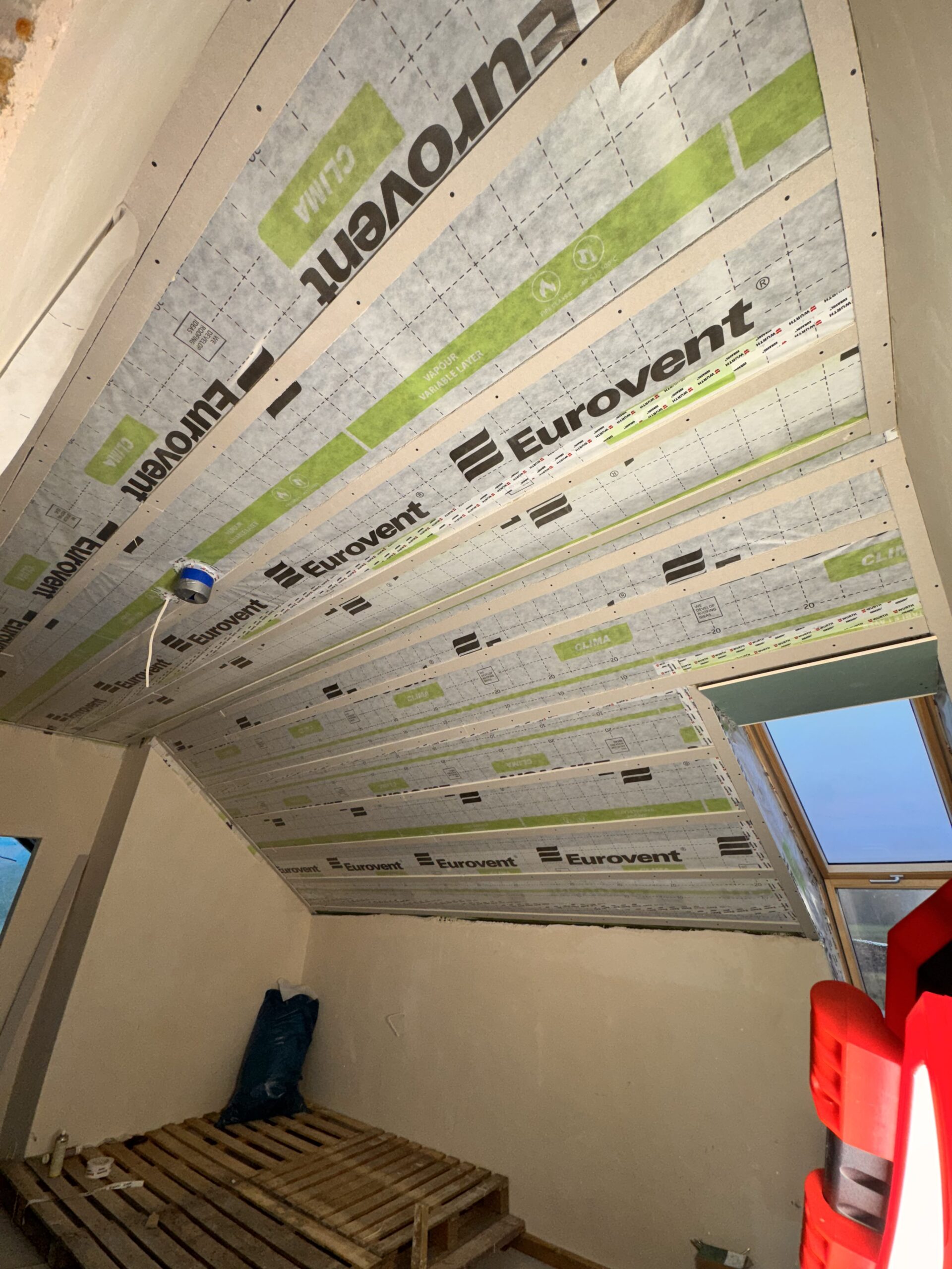 Zabudowa poddasza dachu dwuspadowego kompleskowo z przygotowaniem pod tapety. Przygotowanie do zadmuchu izloacji w skosy i sufit.